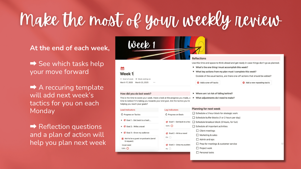 ✨ Weekly Reviews – Take a moment each week to reflect on how things are going. What worked? What didn’t? Use this to adjust and keep improving for next week. Measure both lead an lag indicators.