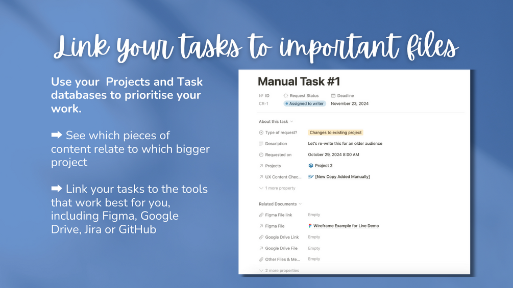 This template is for UX writers, content designers, copywriters, and developers who want to find new ways to manage their content, improve the user-friendliness of their copy and have a clearer picture of their projects and tasks.