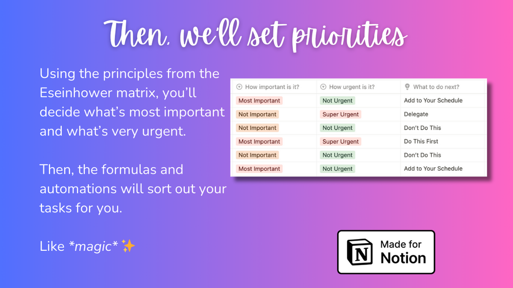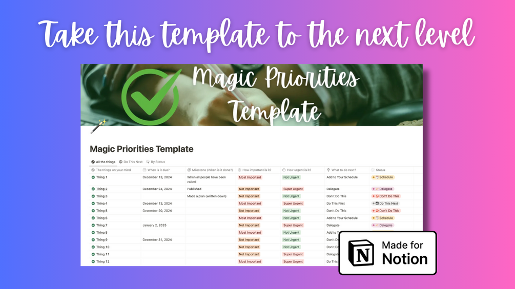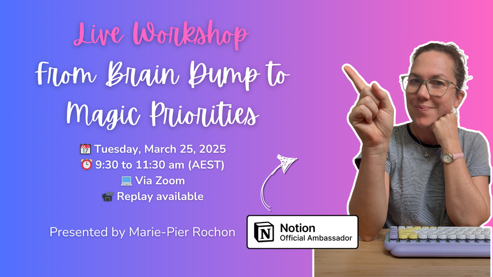 During this live session, you won't just learn how to use the Magic Priorities Notion template, but you'll do the work alongside others so that you have an actual action plan at the end of the session.