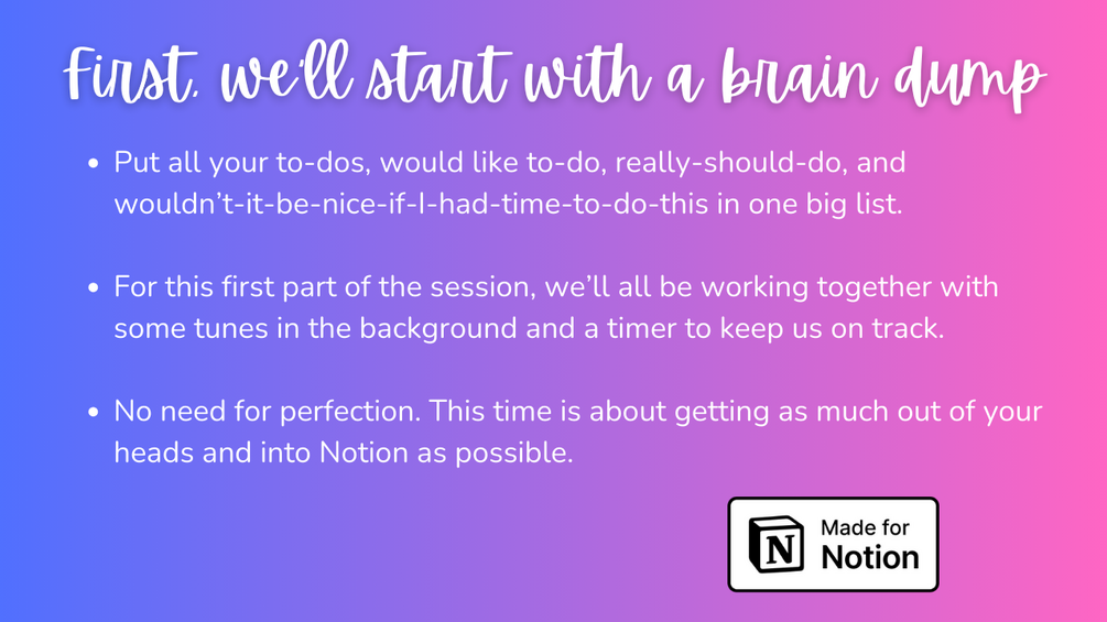 - Then, we'll block off a 15 minute session (with cool tunes) to simply do the brain dumping part of the session