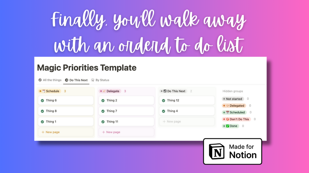 You can do this session using my existing Magic Priorities template (it's free), your own system (I'll show you how to make some tweaks so it works for you), or even start from a blank Notion page.
