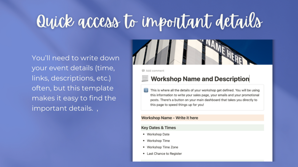 - Pre-written, customisable copy templates for every stage of the process (topic validation social media posts, teaser promo posts, reminder emails, sales page copy, post-event follow-up emails, etc.)