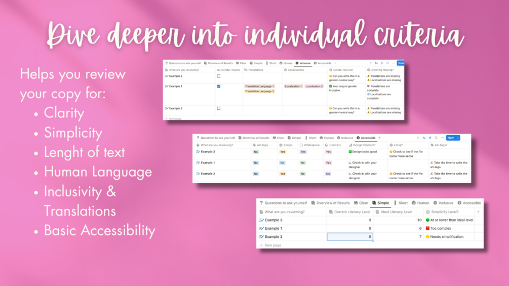 Get clarity on how well your writing meets the most essential criteria for good UX. This interactive Notion template allows you to "score" each piece of content against the following criteria: