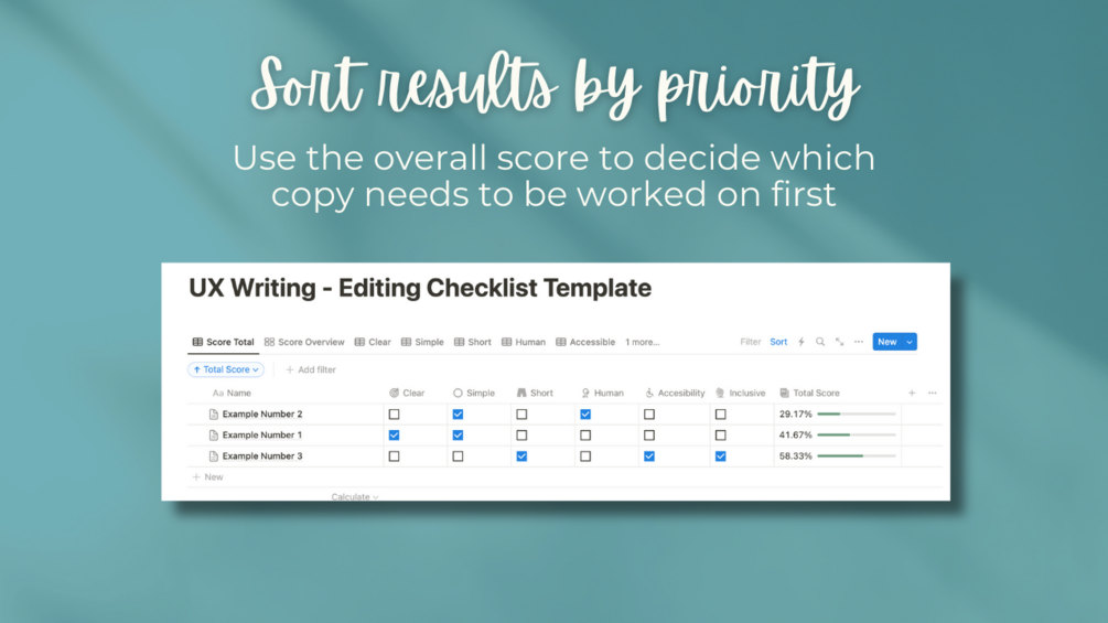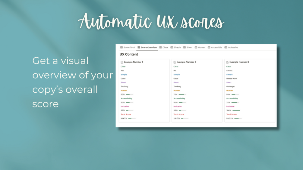 Get clarity on how well your writing meets the most essential criteria for good UX. This interactive Notion template allows you to "score" each piece of content against the following criteria: