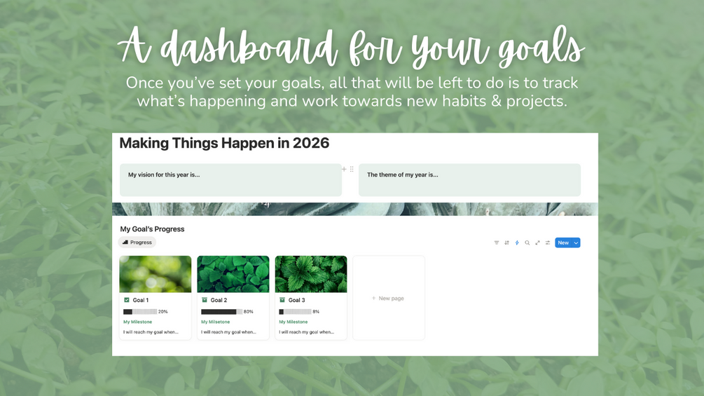 - A year-long dashboard to track your goals, that will be defined after you decide on your next goals.